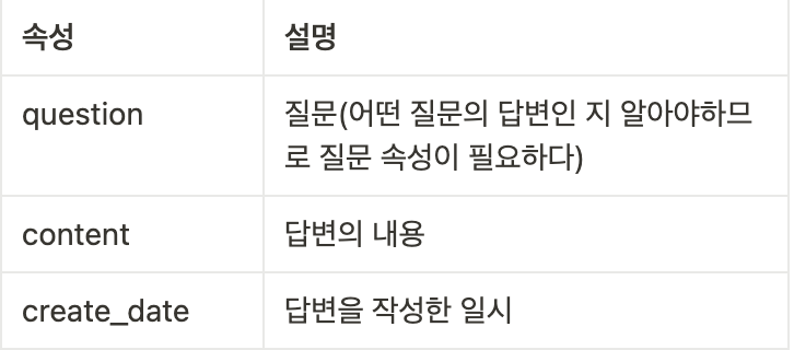 - Answer 모델은 질문에 대한 답변에 해당되므로 Question 모델을 속성으로 가져가야한다.